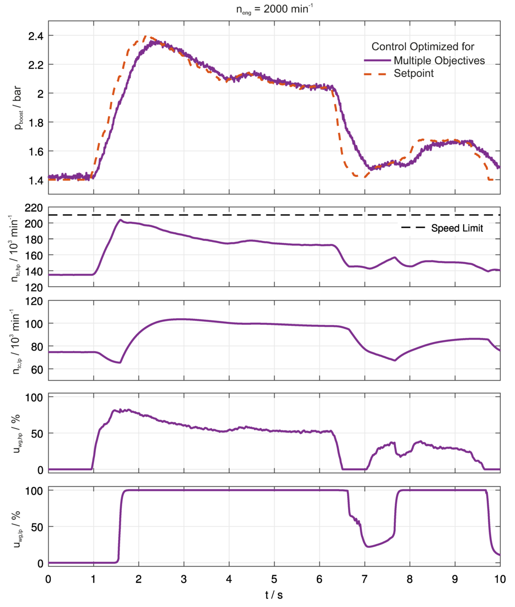 In Figure 7, we can see moreover that the multi-objective control strategy is also able to track arbitrary reference signals. The given setpoint profile was recorded in a vehicle and, thus, represents an exemplary profile for vehicle acceleration. For the given reference signal, the speed limits of the turbochargers are respected. At the same time, the reference is tracked with high control quality, taking into account a fast transient rise, as well as reducing pumping losses by using the low pressure stage.