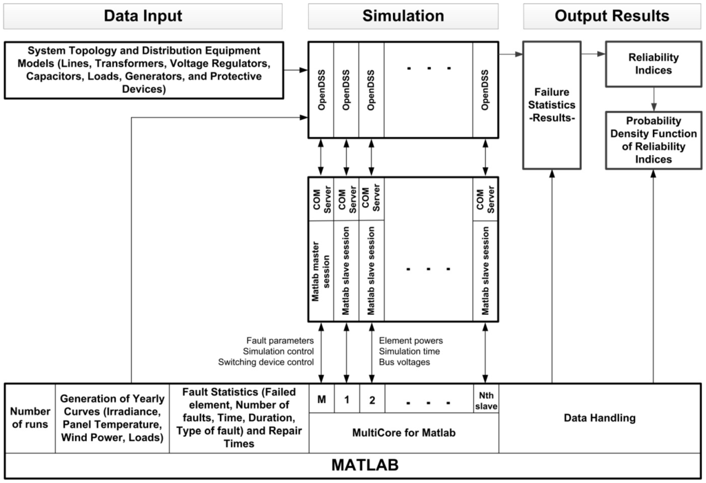 The procedure summarized above has been implemented in MATLAB, which is used to calculate the random variables and control the execution of power flow calculations performed by OpenDSS. Figure 1 shows a diagram with the connections between the different tools used for this work, as well as the information to be inputted to and generated by each tool. Note that all the information required to build and simulate the test system model is generated by means of custom-made applications when OpenDSS capabilities cannot be used. For instance, the algorithms to obtain load and PV generation curves have been implemented in MATLAB, and can be obtained at the time the reliability study is carried out [22,23]. MATLAB also takes care of the simulation results that are needed to calculate reliability indices.