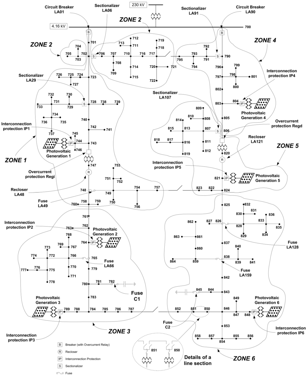 Figure 2 depicts the diagram of the test system. It is a 60-Hz three-phase overhead distribution system based on IEEE test feeders [27]. The figure shows the location of the protective devices and transfer switches that can be used for system reconfiguration and restoration of power. The model includes a simplified representation of the high-voltage system, the substation transformer and all distribution medium voltage (MV)/low voltage (LV) transformers.