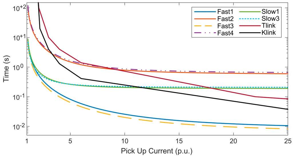 - Protective Devices: Figure 2 shows the type and location of the protective devices installed in the test system. The characteristic time-current curves are similar to those used in [5]; they are shown in Figure 3. The interconnection protection of each generator has over-/undervoltage and overcurrent protection. If a generator is disconnected after a fault, it will be reconnected when normal voltage values at the point of common coupling (PCC) are confirmed (>0.9 pu). On the other hand, it is assumed that PV generators do not suffer any damage during a fault and can be put back in operation as soon as possible. Table 1 provides some information about the devices installed to protect feeders and the interconnection protection of PV plants. Take into account that: (i) reclosers can perform up to three opening operations, two of which use the faster characteristic; (ii) fuses are coordinated using a fuse saving scheme; (iii) sectionalizers count up to two operations before performing an opening action. In all devices with automatic reclosing capabilities, the assumed dead times are 10 and 20 seconds. Except the sectionalizer model, which is a custom-made model, the models used to represent protective devices are those available in OpenDSS.
