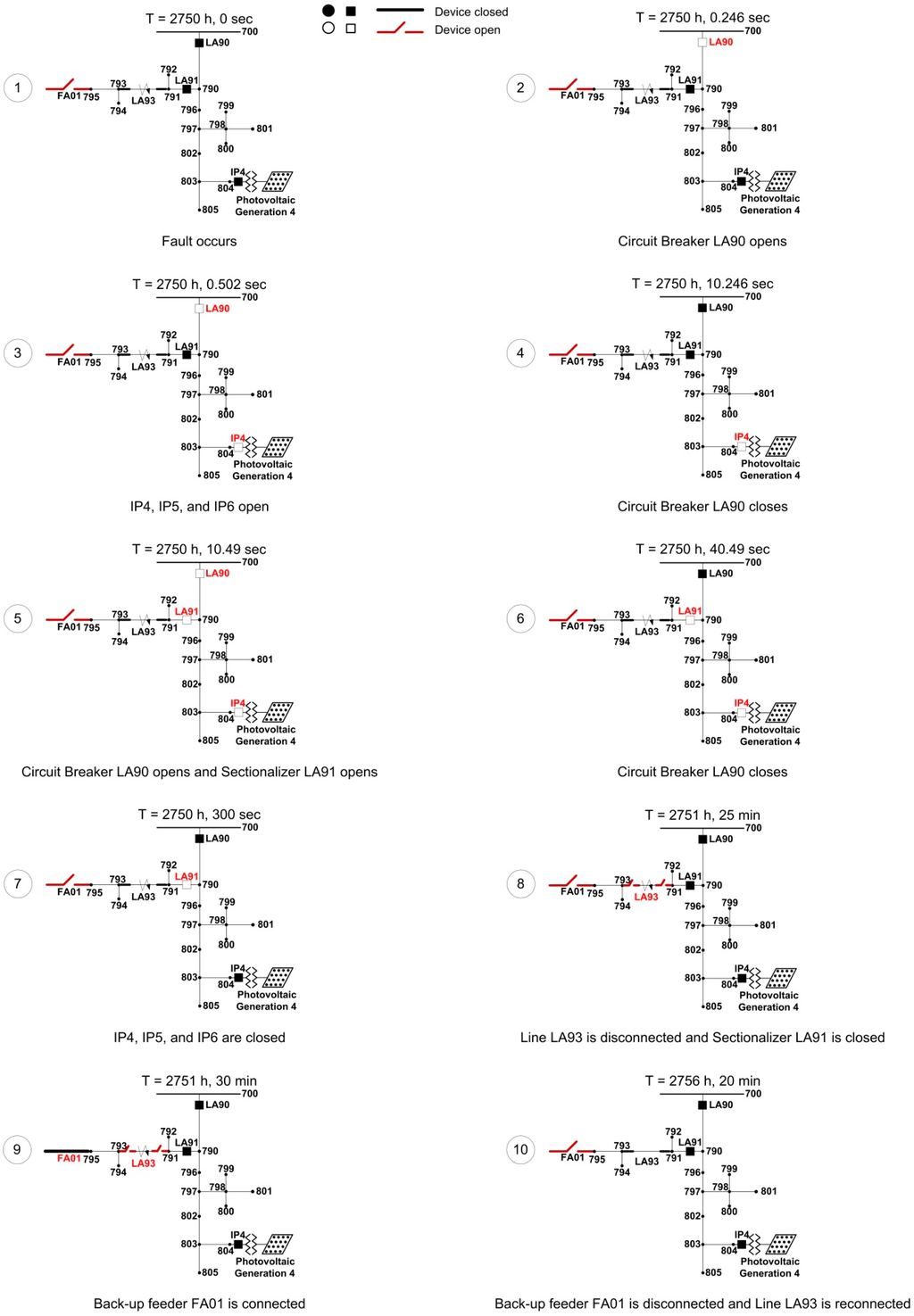 - Figure 4 shows how the configuration of the system changes during the sequence of events caused by the analyzed fault and the status of the various protective devices and switches/disconnectors involved in this case. Remember that, once the fault occurs, the first steps in the sequence of events are caused by the design and settings of the protection system, while the last steps will depend on the performance of the maintenance crew.