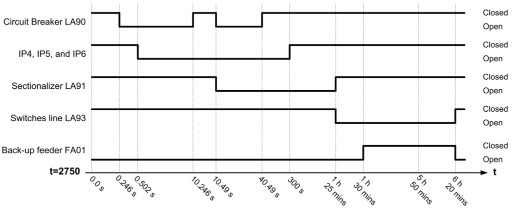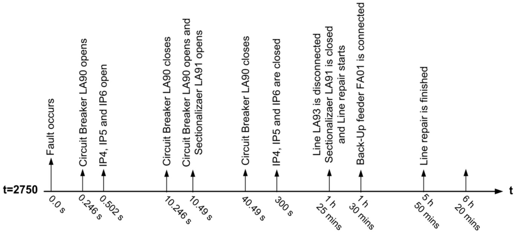 - Figure 5 provides a sequence of events with the time of occurrence of each event. As mentioned above, some of the values required to obtain this sequence are derived from the operation of the protective devices and are of deterministic nature, while others due to the performance of the maintenance crew are of random nature and generated according to the estimated probability distributions, see Section 6.