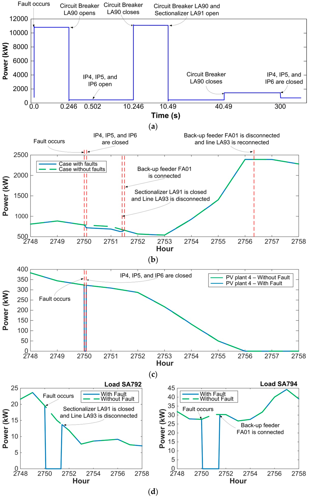 Figure 7 presents some results derived from the simulation of this case study. Note that, except for the first one, the plots have their time scale in hours, and they compare the power curves that result without the fault with those that are a consequence of the fault. The figures also incorporate some information about the operation of protective devices and switching operations.