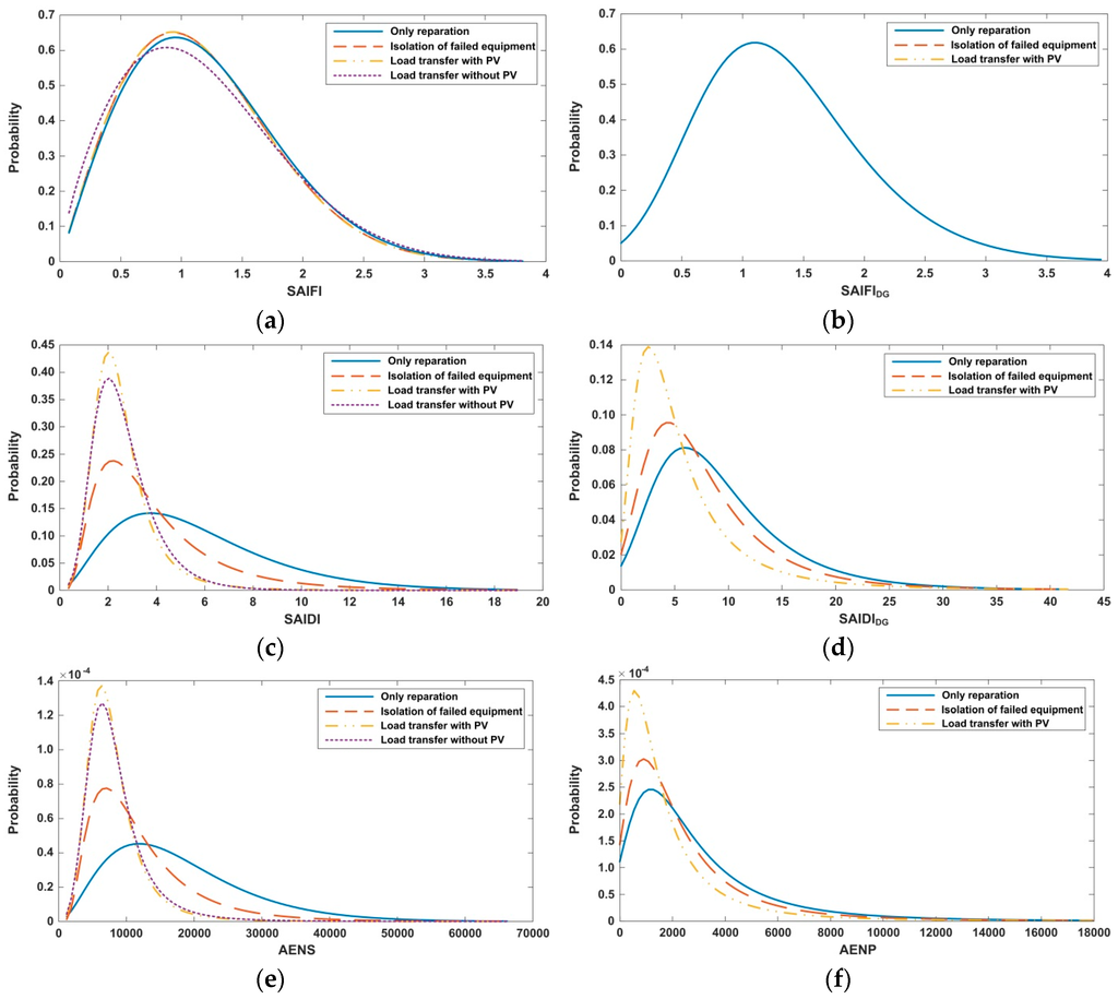 Reliability indices—Probability density functions. (a) SAIFI (int/yr); (b) SAIFIDG (int/year); (c) SAIDI (h/int/year); (d) SAIDIDG (h/int/year); (e) AENS (kWh/year); (f) AENP (kWh/year).
