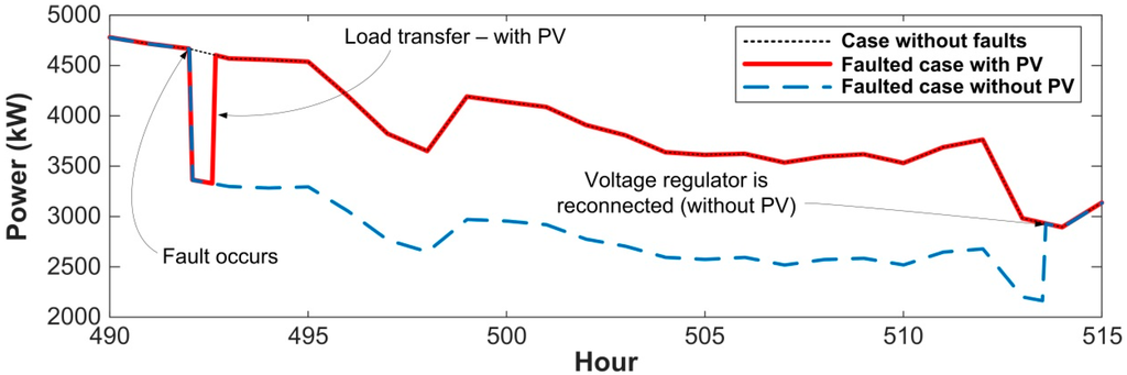 A similar case is presented in Figure 10: a one-phase fault occurs early in the morning (when PV generation is zero) in the line section located between nodes 803 and 805, see Figure 2. One more time, load transfer is not possible due to overload of a voltage regulator. Although the PV generation cannot initially affect the system operation because there is no solar radiation, due to the time required for repair and service restoration, solar generation becomes more important and can help the load transfer option, which would only be feasible with the presence of PV generation; see Figure 8.