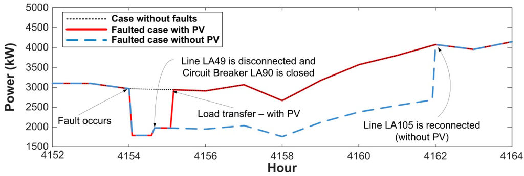 Figure 9 illustrates the impact of a three-phase failure in the voltage regulator located between nodes 743 and 747, see Figure 2. Given the location of the failed component, a load transfer using the intermediate switch transfer should be considered. However, since the failure occurs at noon of a January’s day, the presence of PV generators has a significant impact: without these generators, there would be an overload of the voltage regulator located on the right feeder, and load transfer is not made. As a consequence, service cannot be restored to all load nodes (about 3 MW of rated power) and the actual energy not supplied during service interruption reaches a value close to 23 MWh, see Figure 9.