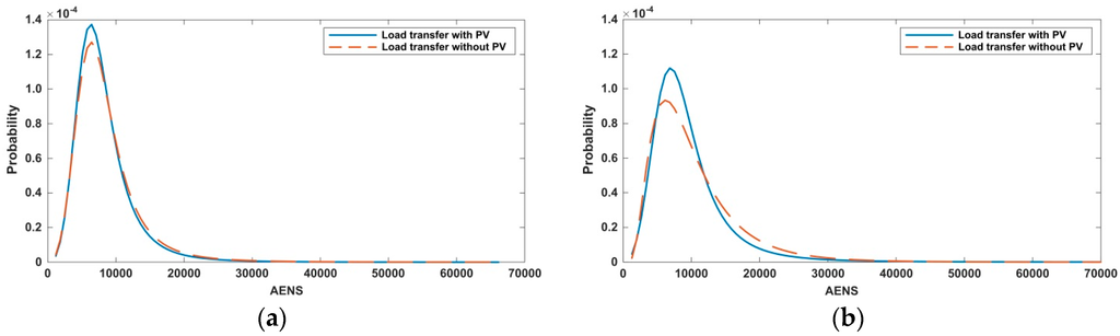 Figure 11 and Table 6 show the reliability indices that result with the initial and the new operating conditions, in which load profiles have been modified in order to produce a load increment during day-time hours without increasing load rated powers. Both studies were carried out considering Scenario 3. Under the new conditions, system reliability becomes more sensitive to PV generation and those indices related to interruption duration (SAIDI, CAIDI, and AENS) increase. Since PV generation can only provide support during day-time hours, PV generation can have a significant impact on system reliability if system loads are predominantly diurnal.