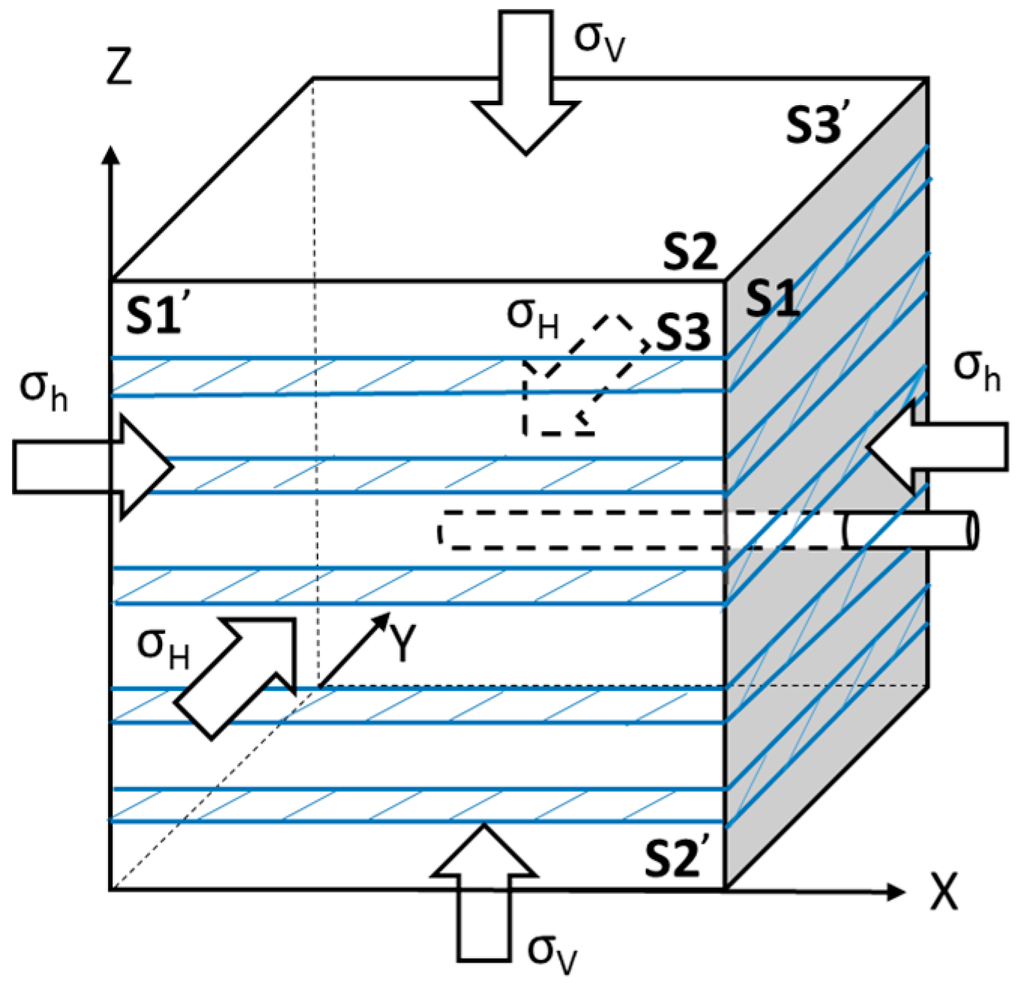 According to the geological conditions, the vertical stress was 2.9 MPa, which was perpendicular to concrete layers on the surfaces S2 and S2’, and was close to the shale formation in-situ field stress of Chang 7-2 shales at 110 m in well JK3 [29]. The effect of horizontal stress difference on hydraulic fractures was not discussed, so horizontal stress difference was kept constant at 1.1 MPa during the experiments. The maximum horizontal stress was on the surfaces S3, S3’ and the minimum horizontal stress was on the surfaces S1, S1’, and both of them were parallel to concrete layers.