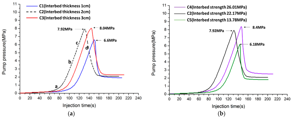 The breakdown pressure of each model block was obtained by measurement and control system and recorded by the pump pressure-injection time curve. Under the same condition of the strength of the B interbed, the breakdown pressure increases as the interbed thickness increases. Under the same condition of the thickness of the B interbed, the breakdown pressure has the same trend that it increases as the interbed strength increases.