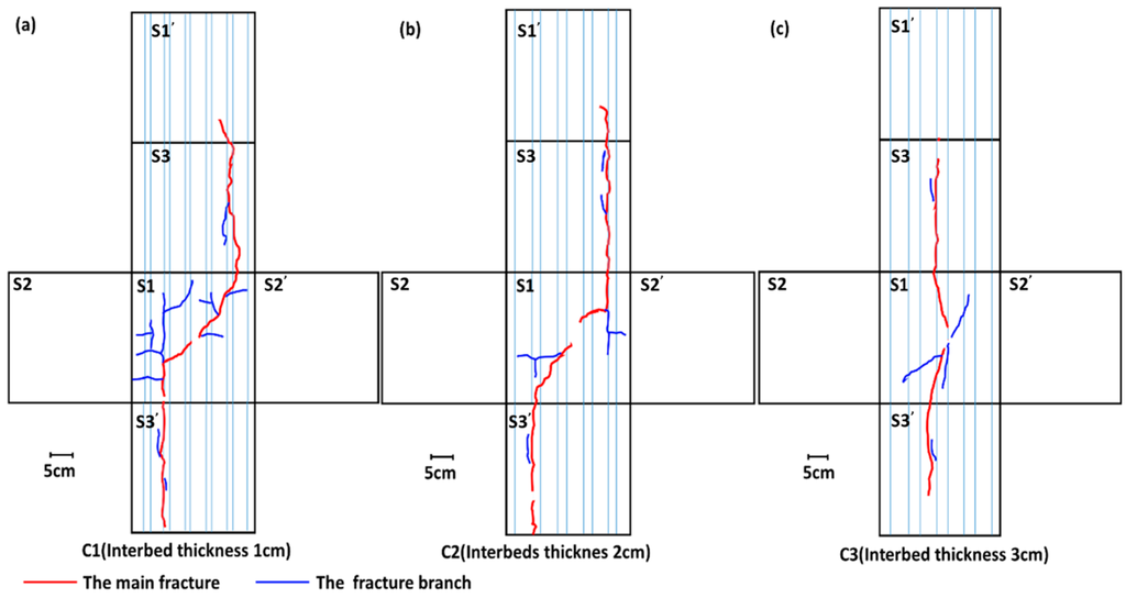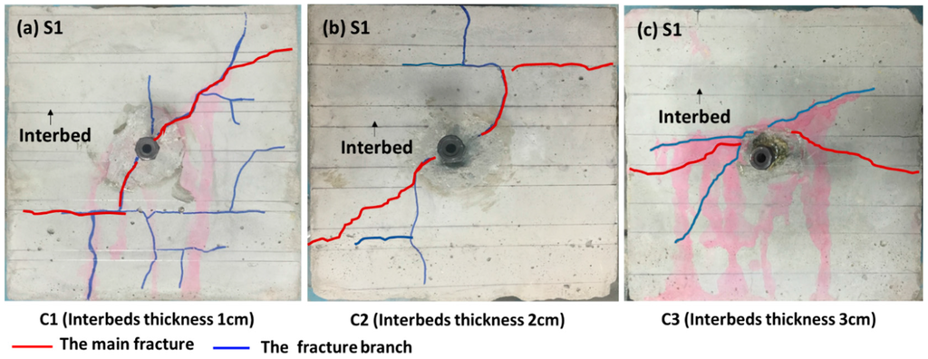 Figure 5 shows the hydraulic fractures on the surface S1 of the model blocks C1, C2 and C3. The red fractures are main fractures and the blue fractures are fracture branches. When the thickness of the B interbeds was 1 cm or 2 cm, the main fracture crossed the interbeds first, then it turned to the bedding face, propagating and breaking along the bedding face. However, when the thickness of the B interbeds was 3 cm, the main fracture propagated and broke mostly along the A layer, the B interbed and the bedding face around the drill hole.