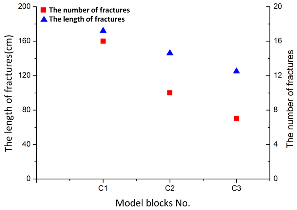 The length and the number of fractures on the surfaces of the model blocks C1, C2 and C3.