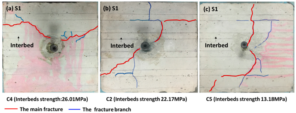 Figure 9 shows the hydraulic fractures on the surface S1 of the model blocks C4, C2 and C5. The red fractures are main fractures and the blue fractures are fracture branches. When the strength of the B interbeds was relatively low (13.78 MPa), the main fracture crossed interbeds, extending along the bedding face, then getting through the A layers and the B interbeds. When the strength of the B interbeds increased (22.17 MPa), the main fracture crossed interbeds first, then turned to the bedding face, propagating and breaking along the bedding face. When the strength of the B interbeds rose to 26.01 MPa, the direction of main fracture mostly completely changed, propagating along the A layer and the B interbed around the drill hole.