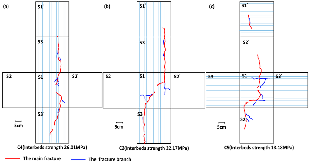 Warpinski et al. [35] and Wright et al. [36] noted the layer material property could impact on the hydraulic fracture propagation and a material property interface could arrest the fracture growth. In the experiments, the three totally different propagation pathways of the main fracture, that are correspondence with the interaction situations pointed out by the scholars [5,6], mainly result from the varying interbed strength. The lower strength interbeds have small resistance to the propagation and extension of fractures under the same conditions of stress and flow rate, so fractures can cross the interbeds, which lead to produce long fractures. In addition, when the fracture extends to the interface, because of the arresting effect of the interface, the fracture propagates along the interfaces instead of crossing the high strength interbeds.