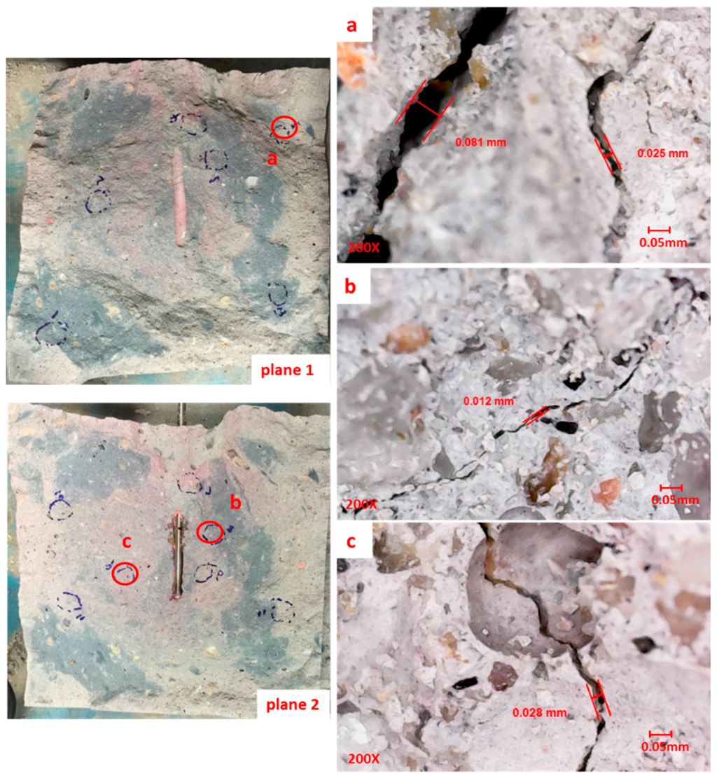 The typical fractures observed by the microscope on the main fracture planes 1 and 2 of model block C4 (the circles on the planes means locations of fractures, and the pictures (a–c) on the right are correspondent with the fractures in the red circles on the left).