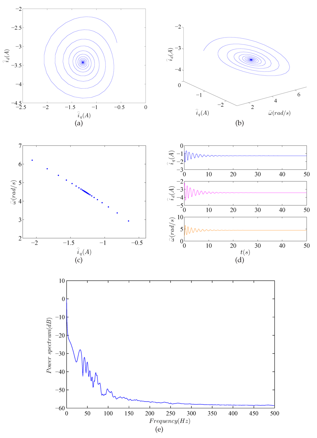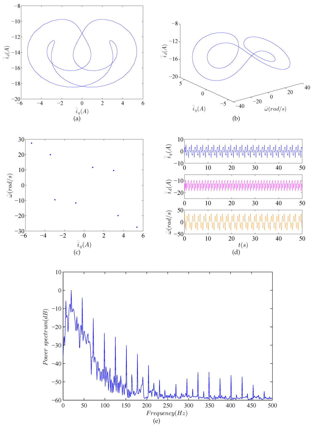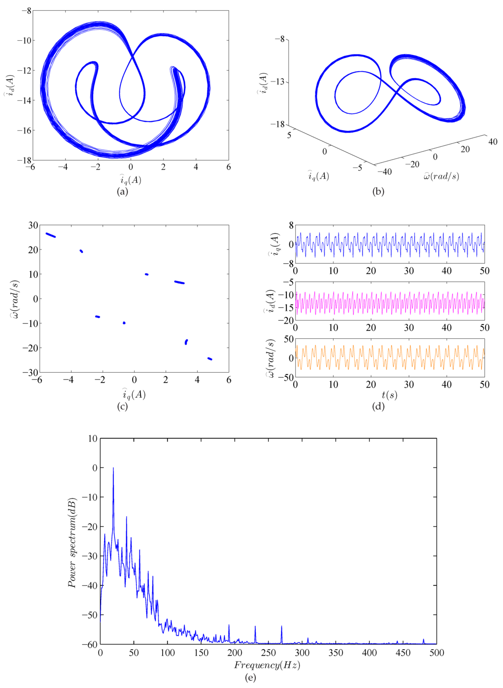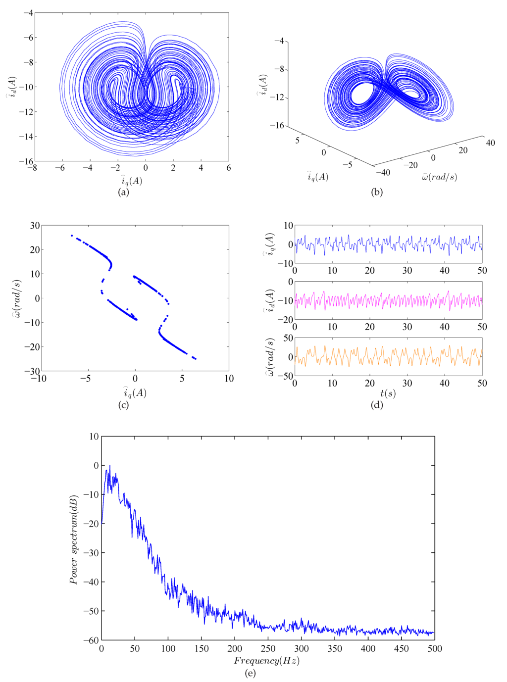 It is well known that the existing mathematical models of generators are multi-variable, nonlinear, and strongly coupled; therefore, these systems can exhibit complex behaviors [8,9,10,11]. It is now a common belief that understanding and utilizing the rich dynamics, such as bifurcations and chaos, of nonlinear systems have an important impact on the modern technology [12,13,14,15,16]. A D-SPMSG is a kind of high-efficient and high-powered generator, and there are still some problems in the D-SPMSG, which exhibits chaotic behavior when parameters of the D-SPMSG are changed or have some special operating conditions [17,18]. The chaotic behavior in D-SPMSG is undesirable since it can degrade the performance of, and even destroy the stability of the generator and make the system collapse. With the development of permanent-magnet materials, the unique advantage of D-SPMSG is increasingly evident and it is widely used in wind power systems [19,20]. In this pursuit, however, research on bifurcation and chaotic phenomena of the D-SPMSG is still behind the rapidly evolving trend of nonlinear sciences and engineering.
