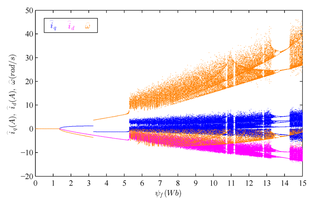 The bifurcation map is used to analyze the dynamical characteristics of the nonlinear system as the system parameter varies. Bifurcation is the main route to chaos from a stable state. The corresponding bifurcation diagram by plotting the maxima of the coordinate , and with parameter varying is as shown in Figure 8. It is clear that the bifurcation diagram coincides well with the Lyapunov exponents spectrum. From Figure 8, the point is a critical point, which is the one of the occurrence of bifurcation. Apparently, as the magnetic flux linkage changes, the running state of the system changes accordingly, which demonstrates that the system is unstable while exceeds the critical value.