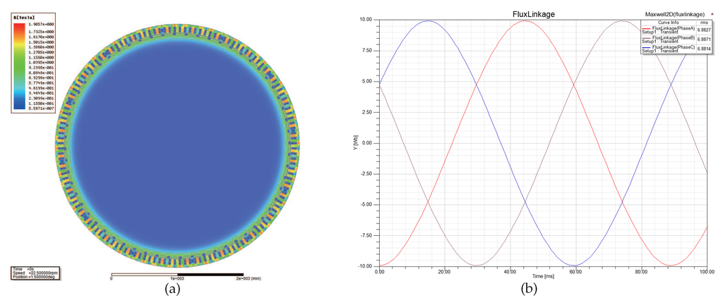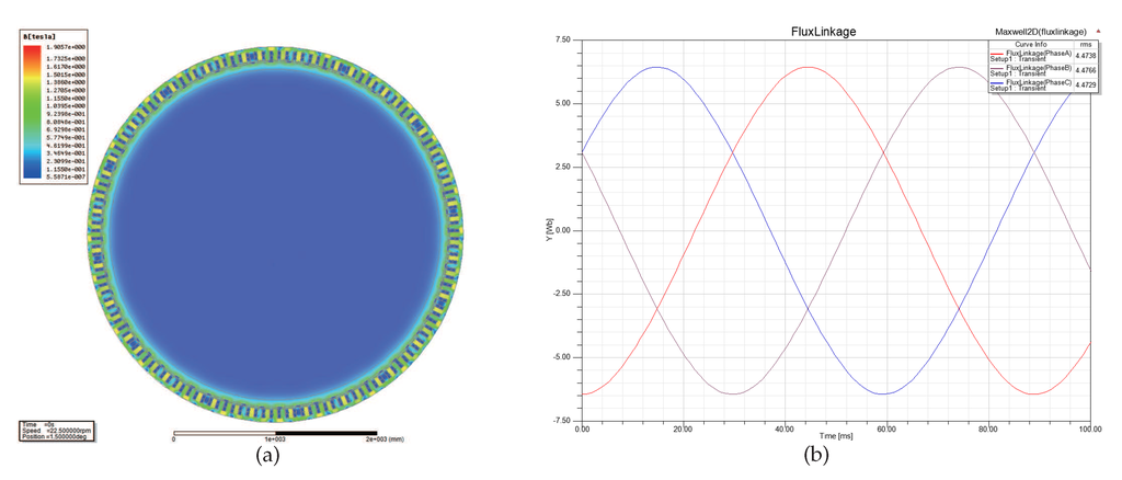 According to the above discussion and analysis, a new kind of magnetic flux linkage optimization method is proposed. First, in order to facilitate the design and dynamic analysis, a new compact representation of the D-SPMSG equations is obtained in this method, and it is discussed in Section 2.2. Second, for the sake of having an optimum value of magnetic flux linkage, the nonlinear dynamic analysis about D-SPMSG with respect to magnetic flux linkage is discussed as described in Section 4. From the Lyapunov exponent spectrum in Figure 3 and the bifurcation diagram in Figure 8, we can know that the system is increasingly unstable, as is increasing, but for the range , the system is obviously steady. Third, in order to further determine an optimum value of magnetic flux linkage, the finite element analysis (FEA) of the D-SPMSG model mentioned in Section 3 will be studied in detail in this section, and also demonstrates the effectiveness of this method.