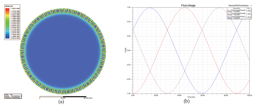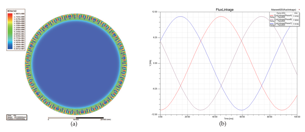Figure 13. Results of finite element analysis with 7.92 Wb in Case 5: (a) Nephogram of magnetic flux density; (b) Corresponding waveform of magnetic flux linkage.