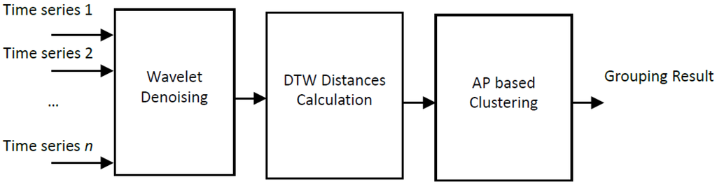 As mentioned before, we utilize the whole battery charge/discharge curve for battery grouping. For obtaining the battery charge curve, the battery is initially fully discharged, i.e., it has a state of charge of 0%, the battery is then charged with a constant current until it is fully charged. During this process, the battery terminal voltages are measured and saved to form the battery charge curve. The process for obtaining the battery discharge curve is similar. Because both the charge curve and discharge curve are time-related, we regard battery grouping as a time series clustering problem. There are three important issues that should be considered before conducting time series clustering. First, noise may exist in the obtained battery charge/discharge data even if the battery is charged/discharged with a constant current. Second, the number of data points may be different with different batteries; thus the lengths of the time series may not be the same. Third, the number of clusters is unknown beforehand. To solve the first issue, a data denoising process should be used. In this paper, we utilize a wavelet based signal denoising [19] technology to smooth the battery charge/discharge data. Because the data lengths vary, the traditional distance metrics, such as the Euclidean distance, cannot be directly utilized. In this paper, we utilize the DTW distance to compute the similarities among different battery charge/discharge curves. Because the number of clusters is unknown, traditional data clustering methods, such as K-means and KNN cannot be directly utilized. For this reason, we use the AP algorithm to perform the time series clustering. The flow chart of the proposed method is shown in Figure 3.