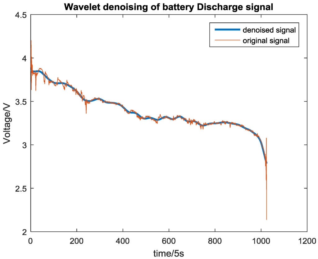 In this paper, we use the symlet wavelet “sym8” which is a compactly supported wavelet with the least asymmetry and the highest number of vanishing moments as the wavelet for signal decomposition. A total level of 5 is used. Figure 4 shows an example of wavelet denoising. As observed from Figure 3, the severe fluctuation of the original noisy signal has been successfully removed after denoising.