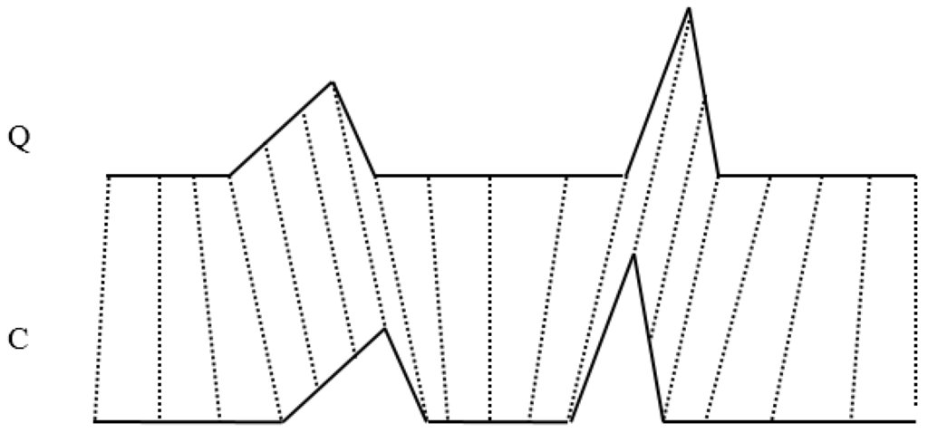 If , a simple way to calculate the distance is to rescale one of the sequences with interpolation so that the two sequences have the same length. Then, we can use the Euclidean distance to measure the similarity. However, this may not be a good strategy for time series with varying time and speed. As shown in Figure 5, two time series have similar shapes and the same length, but the feature points occur at different times. If we still use the Euclidean distance to measure the similarity between these two sequences, a large distance will be obtained, which may not be desired. For this situation, the DTW distance is a better choice to describe the similarity between them. In general, DTW is a method that calculates an optimal match between two sequences. The sequences are “time warped” non-linearly so that the key feature points can be properly aligned.