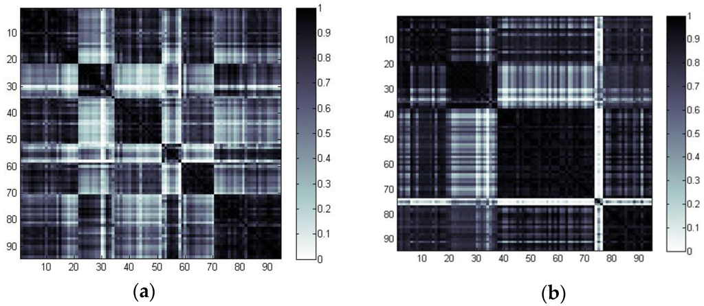 Clustered similarity matrices for discharge curves; (a) The AP algorithm; (b) The spectral clustering algorithm.