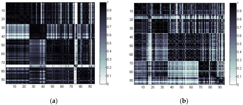 Clustered similarity matrices for the charge curves; (a) The AP algorithm; (b) The spectral clustering algorithm.