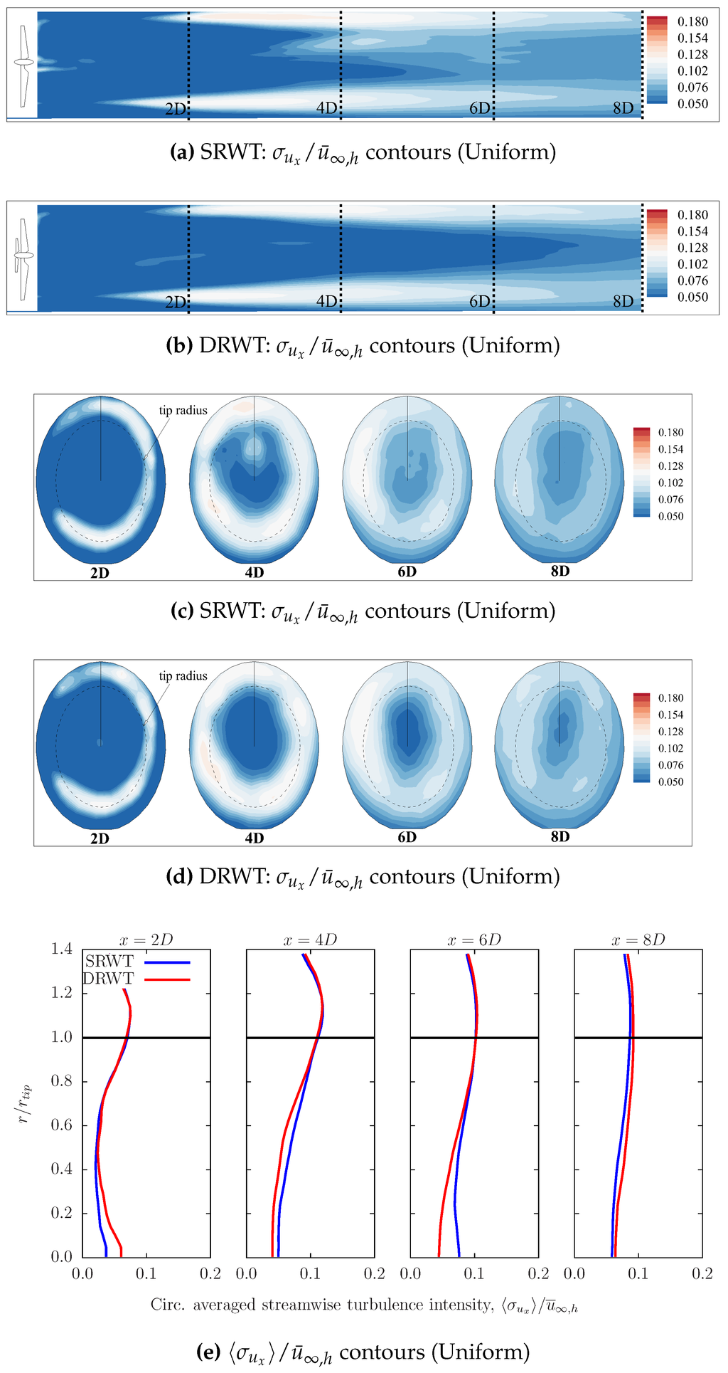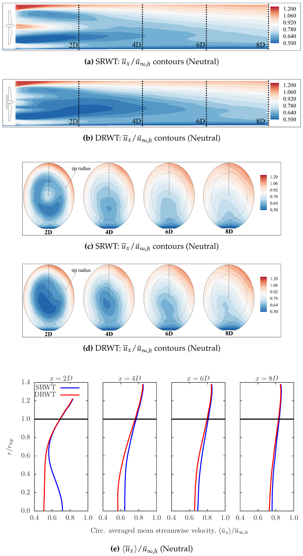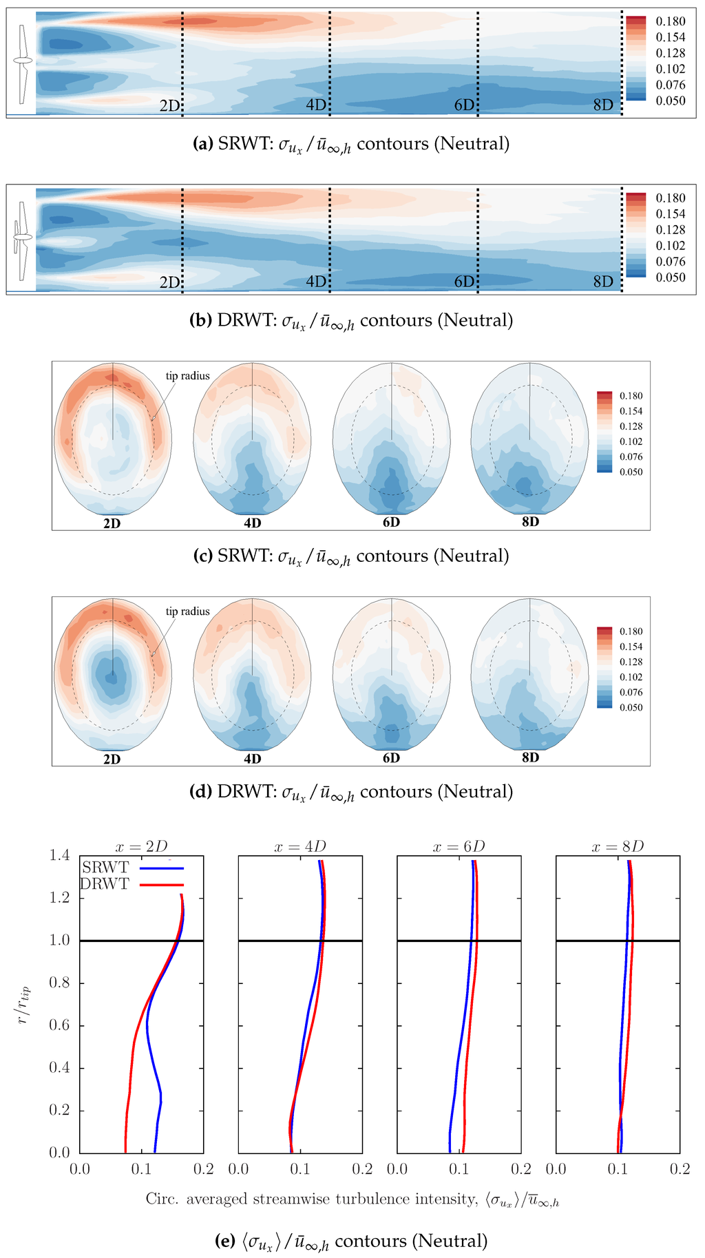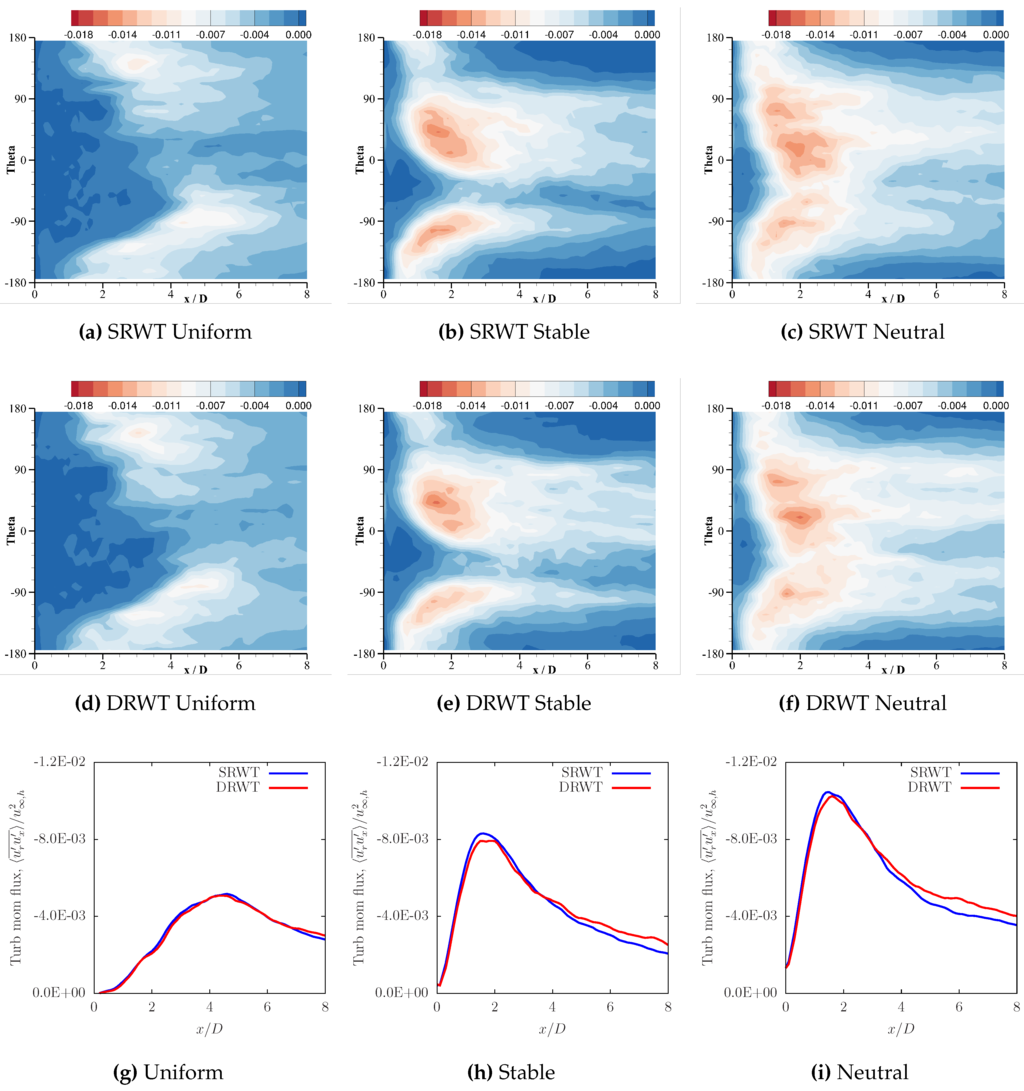- The DRWT enhances wake mixing and entrainment of higher momentum fluid from outside the wake layer when the atmospheric (freestream) turbulence is moderately high (as in the neutral stability case simulated here). A modest () increase in momentum entrainment is observed with the de facto DRWT design.