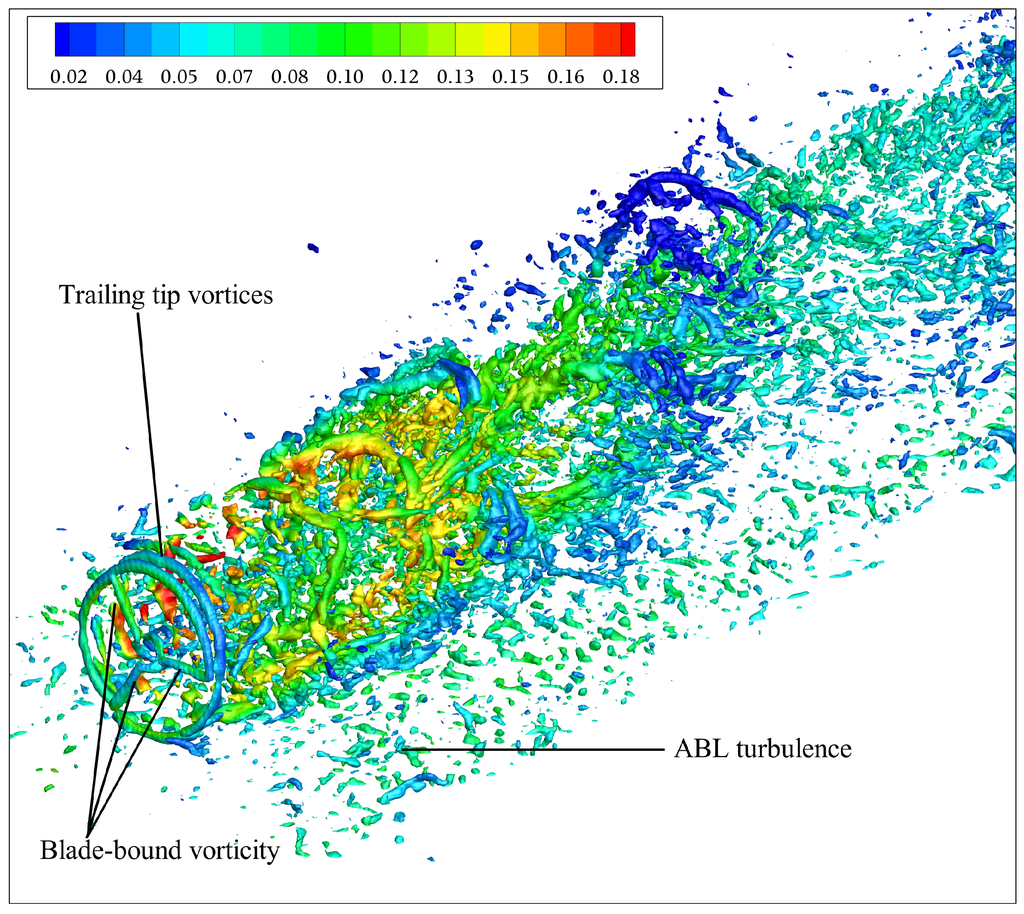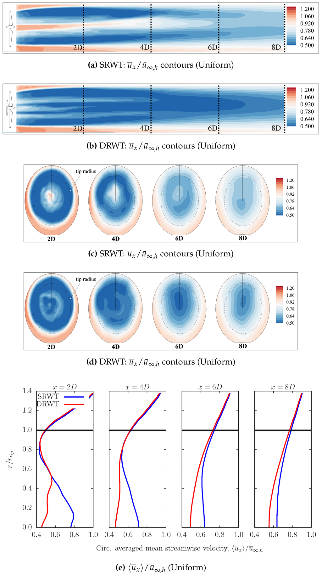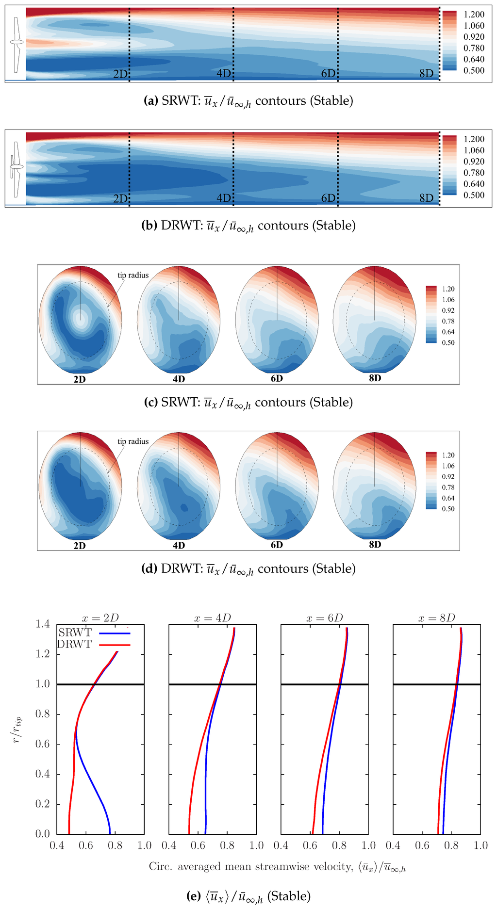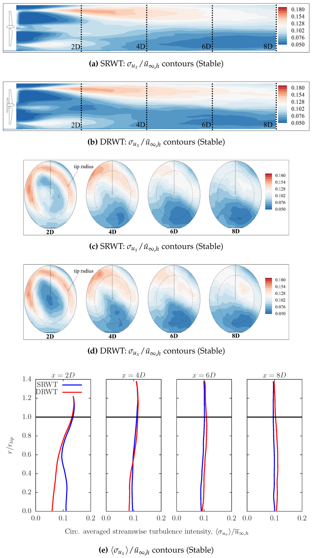 - The DRWT enhances wake mixing and entrainment of higher momentum fluid from outside the wake layer when the atmospheric (freestream) turbulence is moderately high (as in the neutral stability case simulated here). A modest () increase in momentum entrainment is observed with the de facto DRWT design.