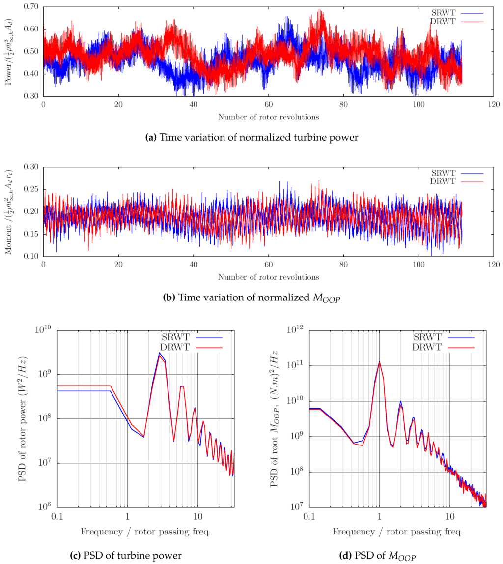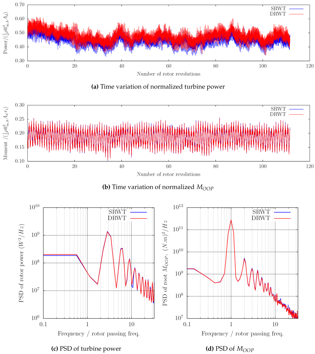 - The DRWT operating in isolation shows aerodynamic performance () improvement of about 5%–6% for all inflow conditions. The performance benefit is obtained due to efficient extraction of energy (using the smaller secondary rotor) from the streamtube going through the blade root region.