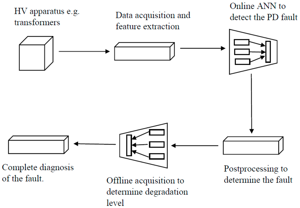 This paper proposed that the ANN could be a potential tool for future CM equipped with improved sensitivity, reliability, intelligence, and cost savings. The question now is how the ANN can be applied to improve CM and its assessment. It is obvious that the ANN on its own cannot perform all the CM functions but it can be used in conjunction with the existing techniques to provide a robust CM tool. Due to many advantages of the online CM, the capability of the ANN to be applied to online monitoring can be examined. Reviewing the literature [41] shows that online CM systems (e.g., PD measurement) have four main parts, i.e., sensors, data acquisition, fault detection and diagnosis. The sensors usually detect the fault and convert a physical quantity to an electrical signal. Then, data acquisition systems process this information from the sensors usually using microcomputers. Finally, the fault detection and diagnosis systems determine the nature of the fault and clear indication for maintenance.