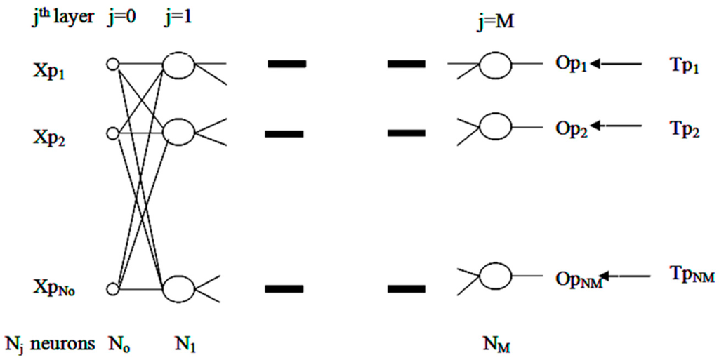 Figure 2 shows how the BP algorithm is implemented together with the neurons (also known as the processing elements). The inputs (XP1, …, XPNo) are initially propagated through the network and the output is computed. Then, the error at the output (TP1, …, TPNM) is back-propagated through the network and the weights are updated according to gradient descent algorithm [34]. This process continues until the mean square value at the output reaches the minimum acceptable value. Some of the major drawbacks of the BP are longer convergence time and susceptibility to training failure [44]. One of the improvements made to address these problems includes adding a momentum term for faster training but at the cost of extra memory space [22,44]. Despite all these issues, the BP has been widely applied for PD recognition because of its easier implementation and ability to provide better PD recognition result as compared to other ANN algorithms. Gulski and Krivda [10] applied different ANN algorithms for PD recognition and the results show that BP provides better recognition result.