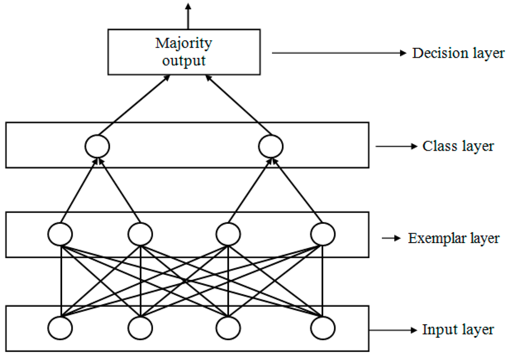 The PNN is a technique based on competitive learning procedure based on the Parzen window concept of multivariate probability approximation [18] (Figure 5). The PNN obtains the probability density function (PDF) based on Bayes’ decision making approach [18,28]. The PNN is made up of input layer, hidden layer and output layer [27]. The hidden layer consists of the exemplar and summation layers. Input parameters are fed into the network through the input layers. The exemplar layer is made up of Gaussian functions formed using a specified set of data points representing the centres [47]. The summation or class layer performs the summing operation of the outputs coming from the second layer for each class [47]. The decision layer then performs the voting—choosing the highest value [28]. Then, the related class label is obtained.
