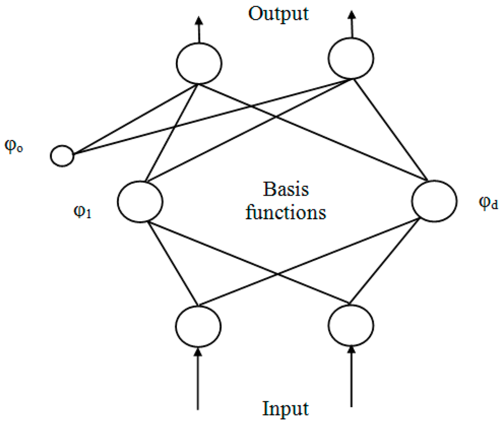 The radial basis function network (RBFN) is another ANN model mostly applied to solve interpolation problems and consists of two layers [43], as shown in Figure 6. The neurons in the first layer do not give the weighted sum of inputs through the sigmoid function. The middle layer consists of the basis functions (φi), mostly made up of Gaussian functions. The centre of the basis function and the network input give the output of the first layer neurons. When the input moves away from a given centre, the neurons output drops off quickly to zero. The second layer of the RBFN network possesses receptive fields because they only respond to the inputs that are closer to their centres [43]. The RBFN provides quicker training and has unsupervised learning characteristics compared to the feed-forward network, but requires many neurons for high-dimensional input spaces.