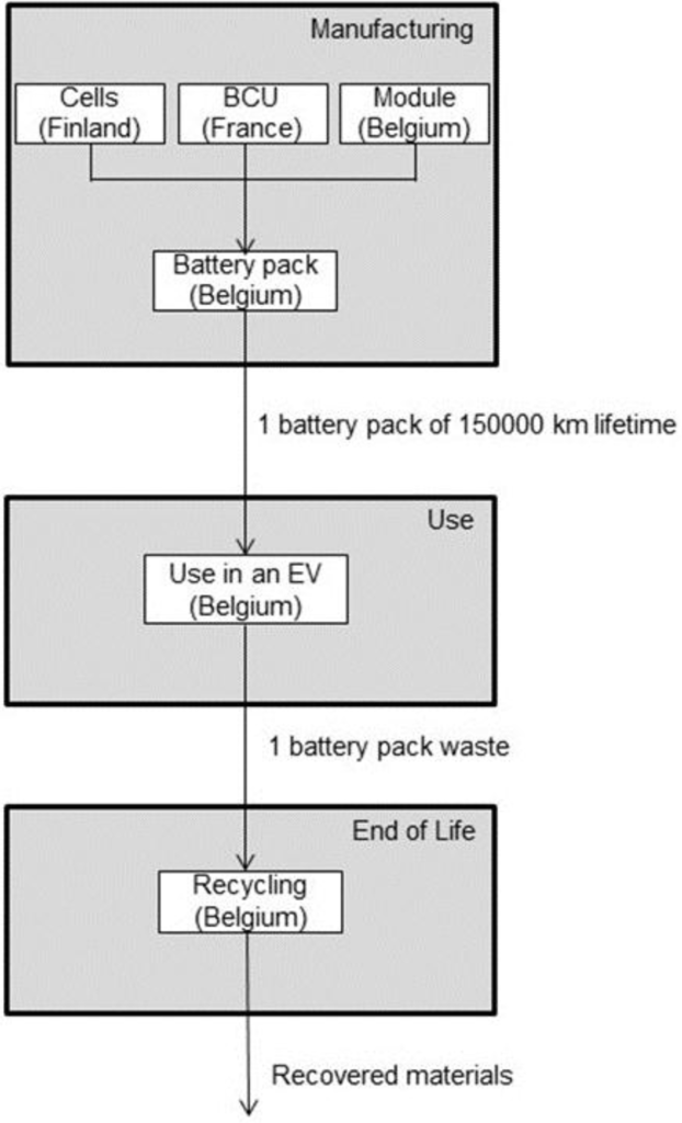 The manufacturing of the ESS is divided into three main components: battery cells, battery control units (BCUs) and modules. The manufacturing of the cells, both HE and HP, is located in Finland, the BCUs are produced in France and the modules and assembly of the final product take place in Belgium. The transport of materials and intermediate products is also considered in the study.