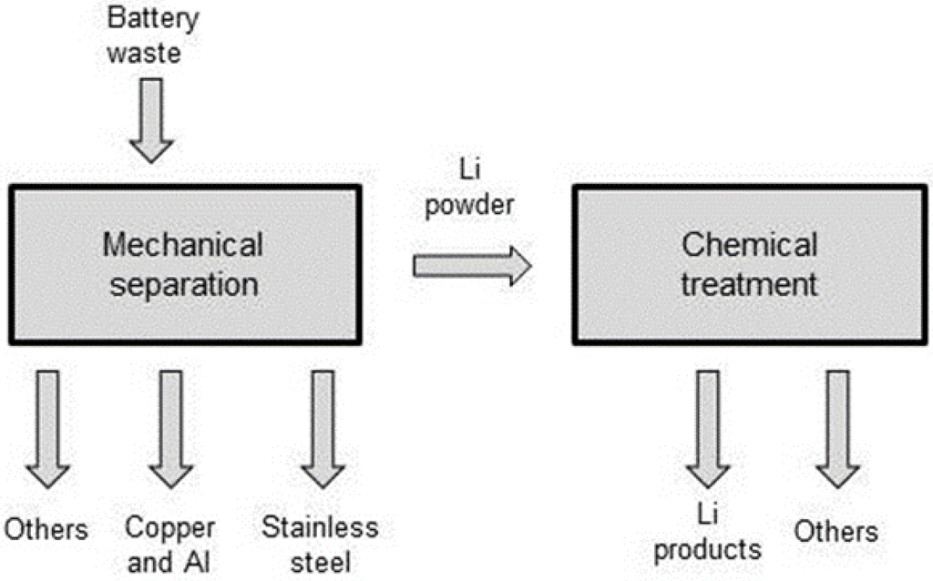 The EoL scenario for the ESS is a hydrometallurgical recycling process. The process takes place at room temperature and it involves a series of mechanical and chemical steps. Figure 2 illustrates a simplified diagram of the hydrometallurgical recycling process. To address the benefits of the material recovery, the recycling process is modeled as a new stage, extending the limits of the system to follow a substitution approach and open-loop recycling scheme. Thus, the materials recovered in the recycling process will enter into another product system, avoiding the use of primary raw materials. Due to this modeling approach of the EoL, the environmental and economic impacts of that life cycle stage have a negative value. In the environmental assessment, the negative sign represents the credit that the studied system receives from the avoided impacts of the manufacturing of the recovered products. In the economic assessment, the negative sign has the same meaning, indicating that the recycling process avoids the production of goods and services that the recovered materials would have produced in another system where they are manufactured in their common industrial process.
