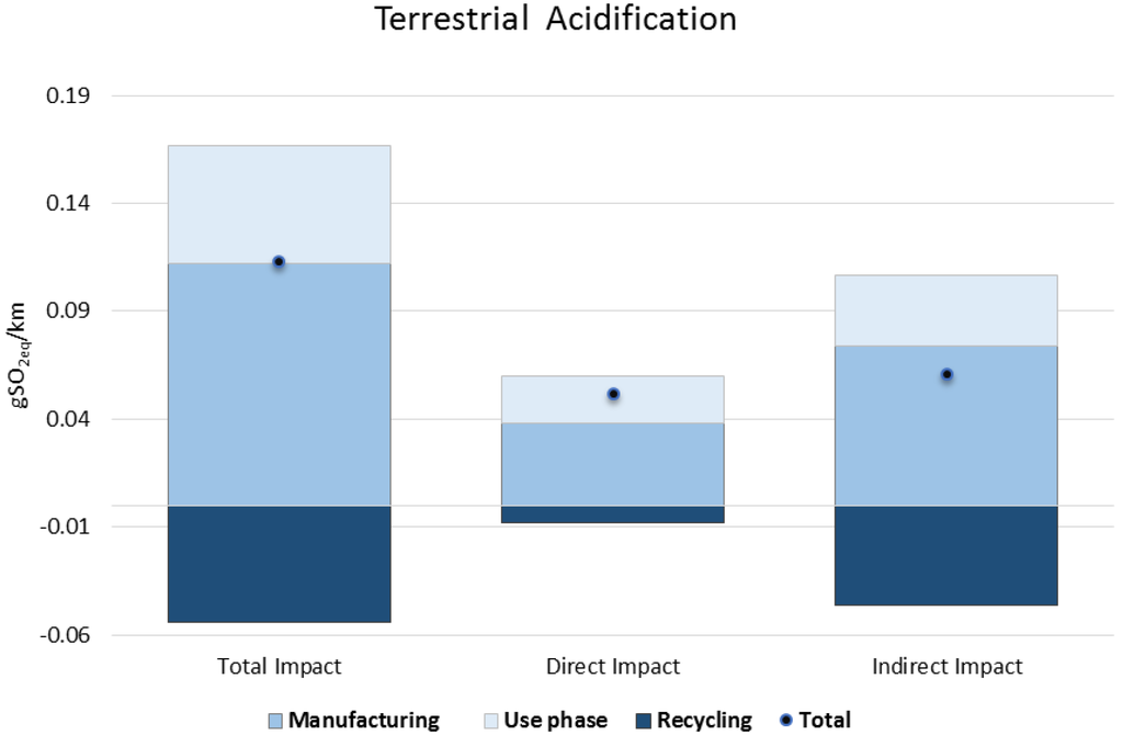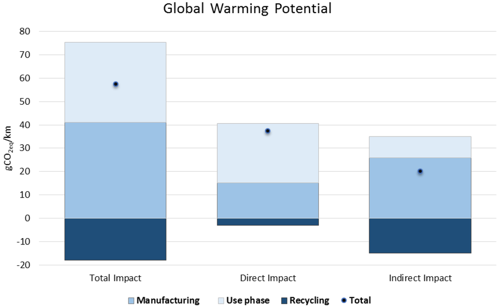 The ESS has impact during its whole life cycle, and, from an MRIO perspective, this is translated to 57.54 g of CO2 euivalent per km. Analyzing in detail the results obtained for GWP, greenhouse gas (GHG) emissions in manufacturing represent 71% of the total emitted, reaching 41 g of CO2 eq. per km, while the use stage is responsible for around 60% of the total. It must be highlighted again that negative figures from the EoL stage result from the substitution approach due to materials recovery.