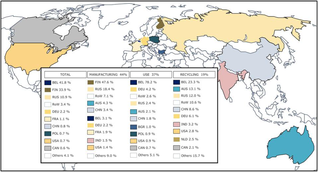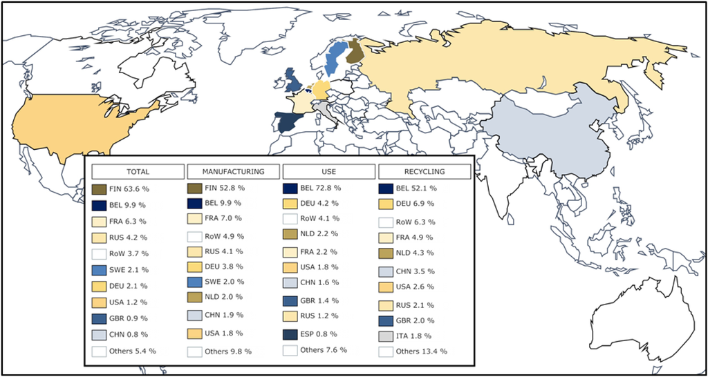 The negative values during the recycling stage, as mentioned before, result from the substitution approach considered in this study. Recovery and recycling of materials will avoid the production of raw materials that provide the same services. This means that the economic stimulation that would happen with these raw materials new demands is being avoided. Thus, it gives a negative credit to the total economic input of recycling. As the hydrometallurgical recycling plant is based in Belgium, it is Belgium who receives more credit from the recycling followed by the countries that supply goods and services to the production of the avoided materials. Thus, the total Belgium production of goods and services is cut to a 9.93% of the generated during the life cycle of the ESS, even though Belgium produces a total of in goods and services during the use stage. The largest producer of goods and services along the life cycle of the ESS is Finland, as it is not influenced by the recycling.
