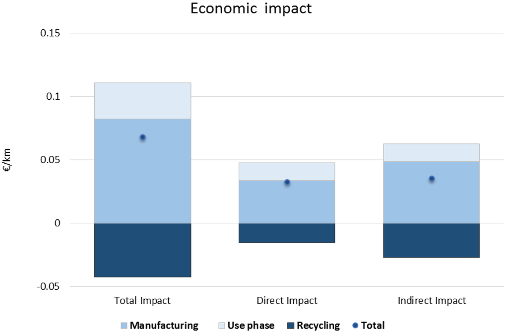 Figure 8 includes the results of the economic impacts during the life cycle of the ESS, measured as the production of goods and services in (€) from the industry sectors of the WIOD. The figure shows that the life cycle of the ESS generates an impact of 0.068 €/km.