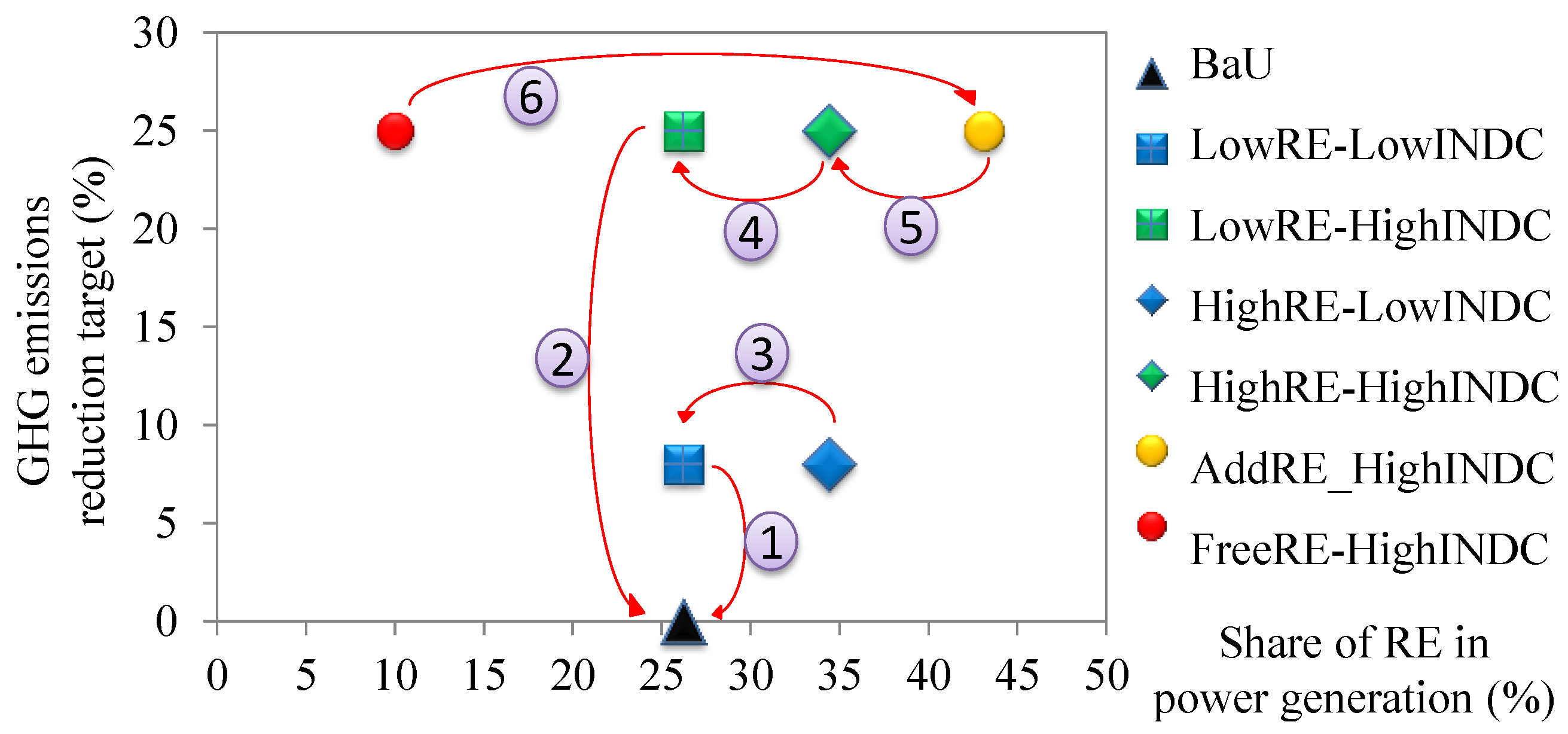 The BaU scenario has no GHG emissions reduction target, while the targets for the other scenarios were assumed to follow the INDCs [12]. The LowRE-LowINDC and HighRE-LowINDC scenarios aimed to reduce at least 8.0% of 2030’s BaU emissions as an unconditional target, while the LowRE-HighINDC, HighRE-HighINDC, AddRE-HighINDC, and FreeRE-HighINDC aimed to reduce 25.0% of 2030’s BaU emissions as a conditional target.