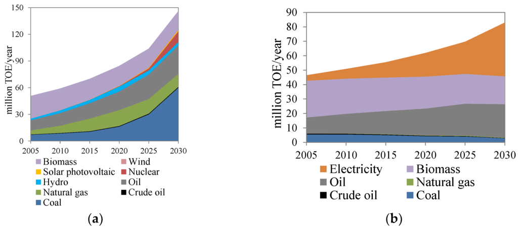 The primary energy supply increased from 50.7 million TOE in 2005 to 160.0 million TOE in 2030, which was a bit higher than the projection in the Asia Pacific Energy Research Centre (APERC) report (150.0 million TOE in 2030) [40]. Currently, Vietnam is a coal exporter; however, the actual trend, and even the PDP7, show that Vietnam will become an energy importer in the next few years, as a result of its high growth in energy demand and the limitations on available energy resources (particularly coal, oil, and electricity). Among the energy carriers, coal and nuclear have experienced a rapid increase due to the demand for these energy types in power generation since 2020. In 2030, the expected coal supply contributed 41.2% of total primary energy supply, followed by oil (21.8%), biomass (13.9%), natural gas (10.1%), nuclear (8.3%), and other renewable energies (hydro, wind, and solar—4.1%) (Figure 2a). The primary energy intensity was projected to be reduced from 937.8 TOE per unit of GDP to 585.6 TOE per unit of GDP (37.6% reduction). This projection is consistent with the APERC report, where the primary energy intensity is projected to reduce from 286.0 TOE per 2005 USD million purchasing power parity (PPP) in 2005 to 164.0 TOE per 2005 USD million PPP in 2035 [40].