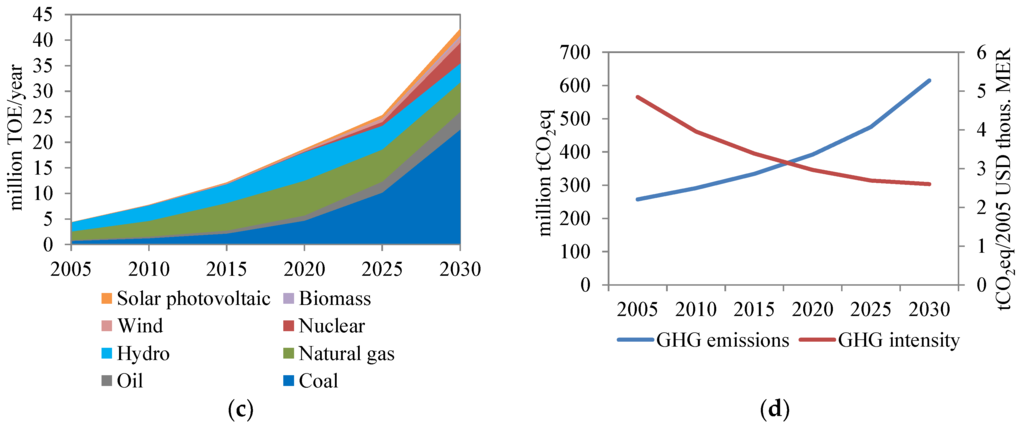 The GHG emissions per capita of Vietnam in 2005 were about 3.1 tonnes of CO2 equivalent (tCO2eq), which is one of the lowest values in the Asia-Pacific region [41]. With the rapid increase of socio-economic development and energy consumption, the total GHG emissions increased from 257.1 million tCO2eq in 2005 to 614.9 million tCO2eq in 2030. This projection is consistent with Vietnam’s industrialization vision, in which the economy uses more carbon-intensive energy sources, and in particular is dependent on coal-fired power plants. The increase in GHG emissions in 2030 was caused by a three-fold increase of CO2 emissions due to energy-related activities, while the increases in N2O and CH4 emissions were relatively modest. The emission intensity was expected to be reduced by half, from 4.8 tCO2eq per 2005 USD thousand MER in 2005 to 2.6 tCO2eq per 2005 USD thousand MER in 2030 (Figure 2d).