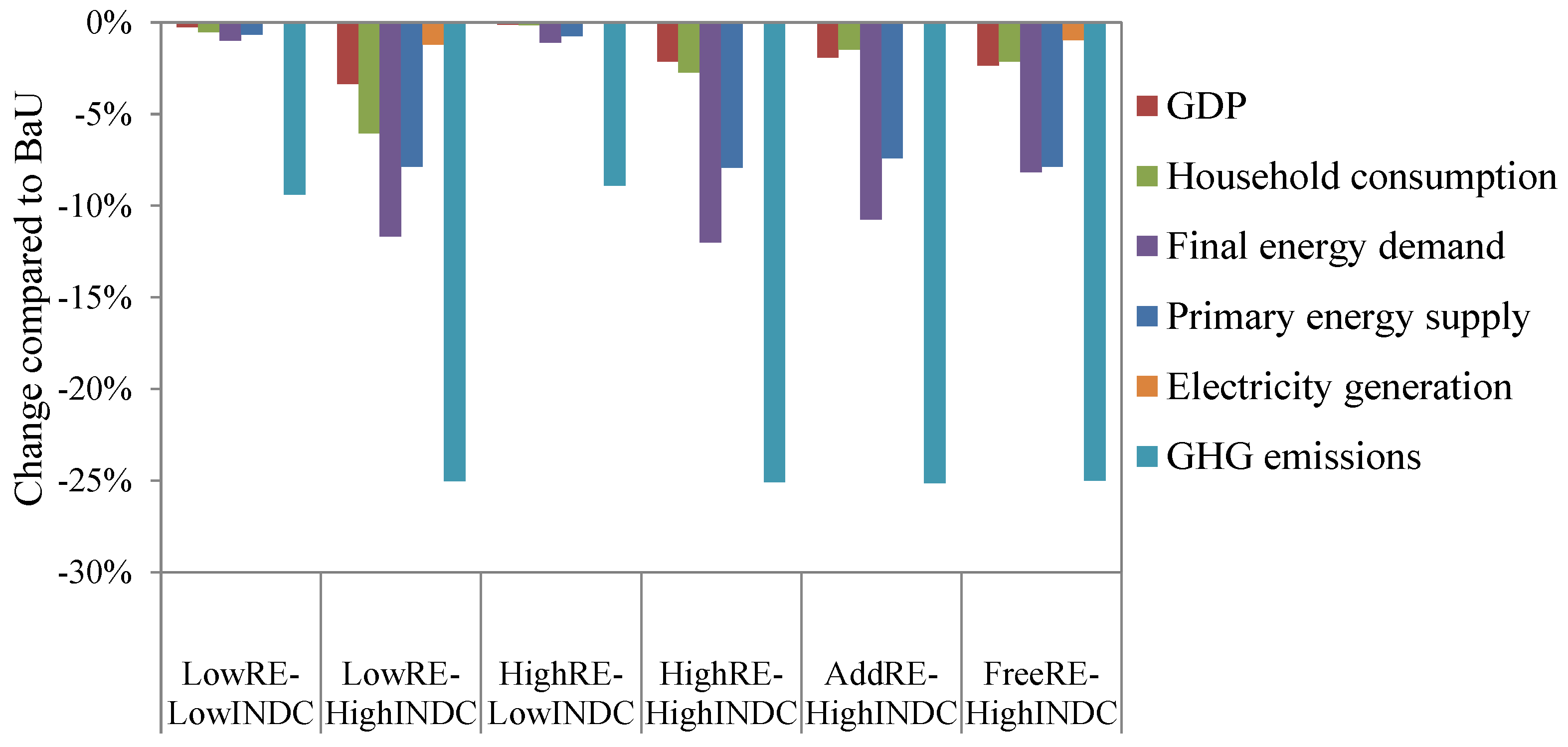 In the AddRE-HighINDC scenario, where the share of wind and SPV increased two-fold compared to the HighRE scenarios, the contribution of renewable energies in the power generation mix increased to 43.1% (23.7% biomass-SPV-wind, 9.3% hydro, and 10.1% nuclear). An 8.7% increase from SPV and wind substituted for the same reduction in the amount of coal consumed for electricity generation. In this scenario, there was a 1.9% GDP loss and a 1.5% welfare loss, with the potential to reduce total GHG emissions by 25.0%. The effect on the energy system was a 10.8% reduction in final energy demand, a 7.4% reduction in primary energy supply, and no effect to the electricity generation (AddRE-HighINDC).