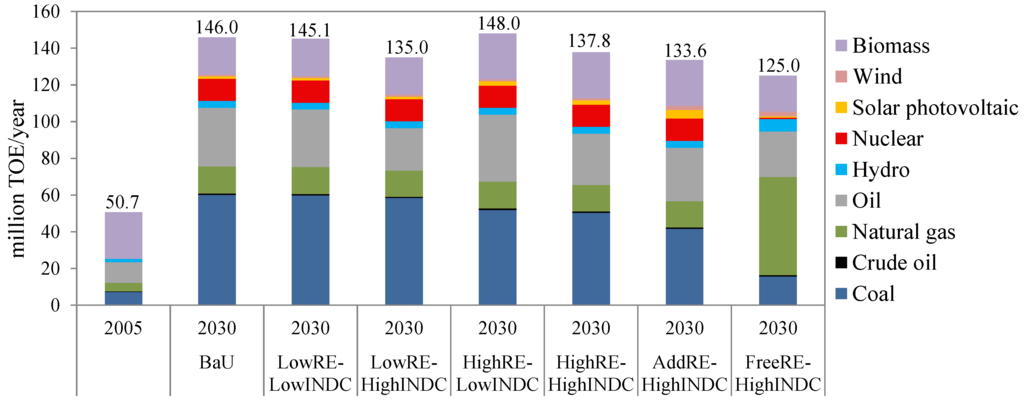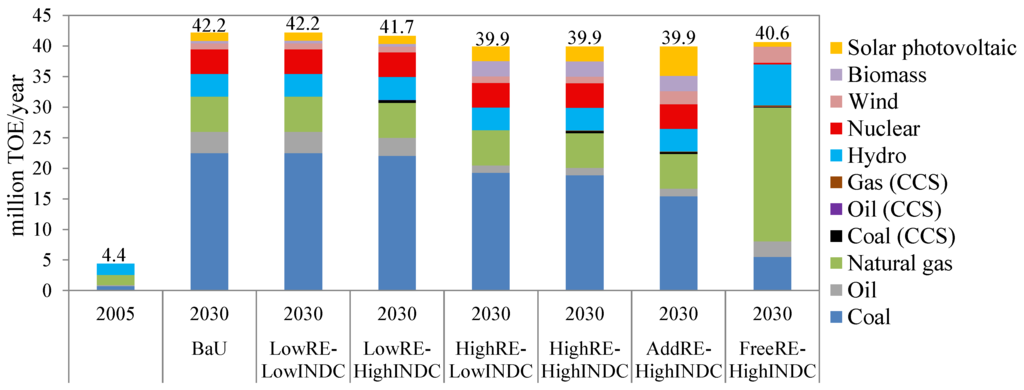 Different from the results of policy-based scenario, the pricing-only scenario (FreeRE-HighINDC) showed the domination of natural gas in the total primary energy supply rather than the deployment of renewable energies. The total primary energy supply in this pricing-only scenario was reduced 14.4% compared to the BaU scenario that may challenge the energy security of the country.