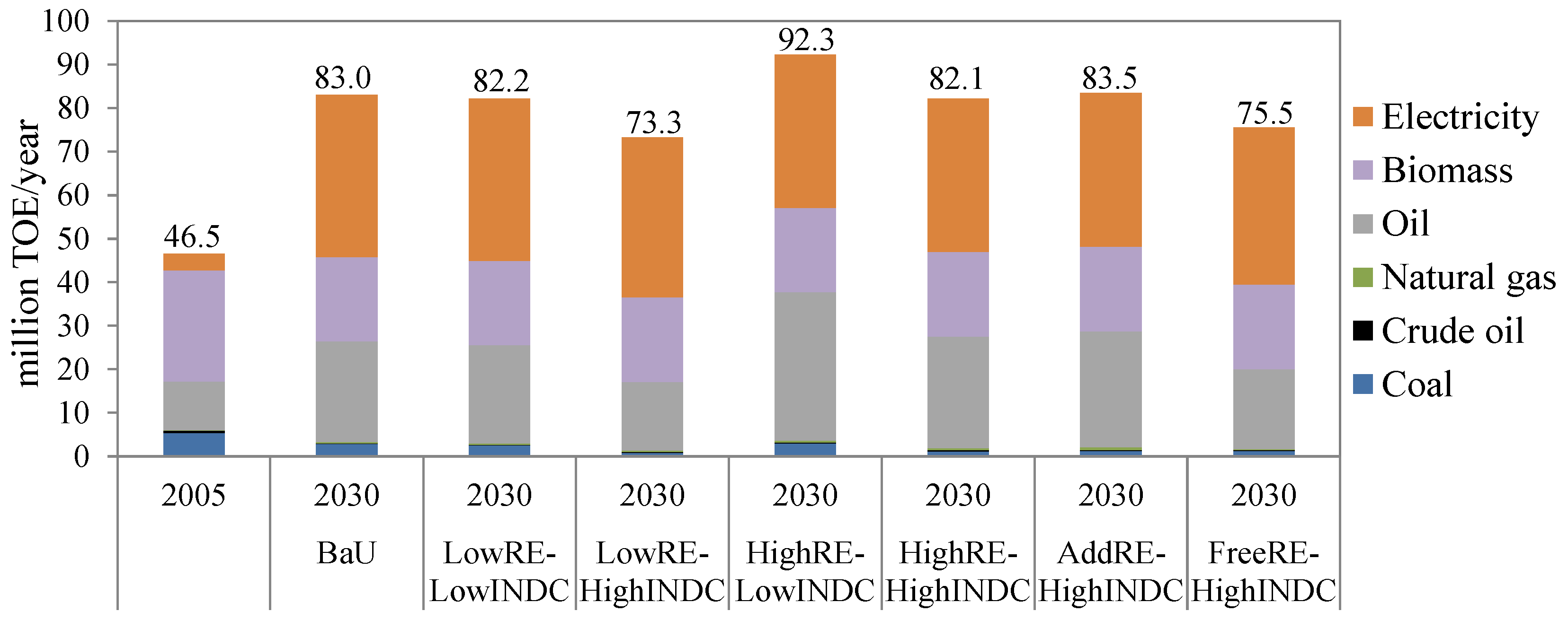 Moreover, when the contribution of wind and SPV increased two-fold, the final energy consumption was maintained at 83.5 million TOE (AddRE-HighINDC). This lesser reduction in the final energy demand, compared to BaU, would enable some industries to retain the use of their oil-consuming production machinery; thus, there was less pressure for them to fully switch to new or advanced technology in the medium term. On the other hand, in the FreeRE-HighINDC scenario, the final energy consumption was reduced to 75.7 million TOE, with the energy mix is similar to LowRE-HighINDC scenario.