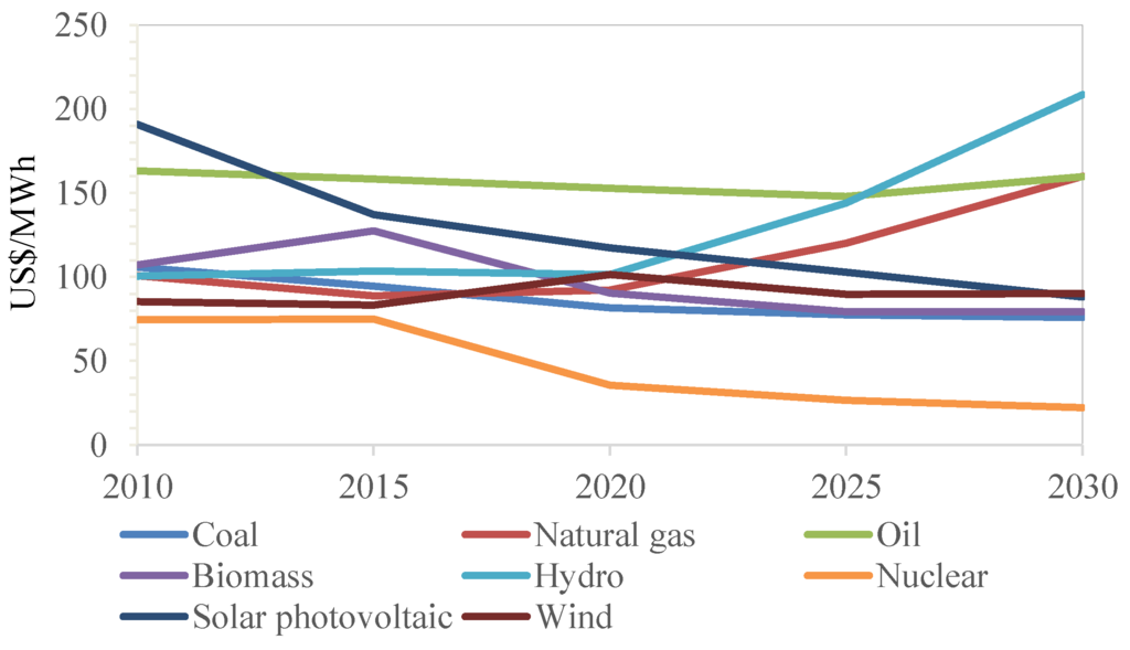 The INDCs target is more ambitious than the NGGS target, and thus more risky to the nation’s energy security [13], with the country still being very dependent on traditional fossil fuels [14]. Therefore, to support the achievement of the INDCs’ target, in November 2015 the Vietnamese government approved the renewable energy development strategy (REDS) [15]. Compared to previous energy development plans such as the national energy development strategy (NEDS) [16] and power development plan 7 (PDP7) [17], published in 2007 and 2012, respectively, the contribution of renewable energies (RE) in the REDS was increased, and included more deployment of biomass, solar photovoltaic (SPV) and wind power. Previous studies have also identified the potential of renewable energies in Vietnam, either for final consumption or for power generation [18], highlighting the economic benefit [19] of sustainable development [20]. The role of renewable energies in climate change mitigation has been assessed, especially biomass [21], SPV [22,23], and wind [24,25]. However, GHG emissions reduction generally has a cost and sometimes is not small enough to ignore, especially in developing country like Vietnam [26]. For example, Mittal et al. [27] reported that the cost involved depends on the strength of the emissions reduction and renewable energy policy.