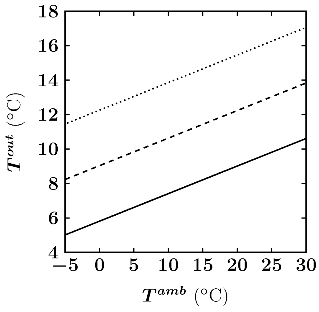 The output temperature of the PVT panels as a function of the ambient temperature. The input temperature of the PVT panels is set at 5°C. The solid line corresponds to a global radiation of 100 , the dashed line to a global radiation of 300 and the dotted line to a global radiation of 500 .