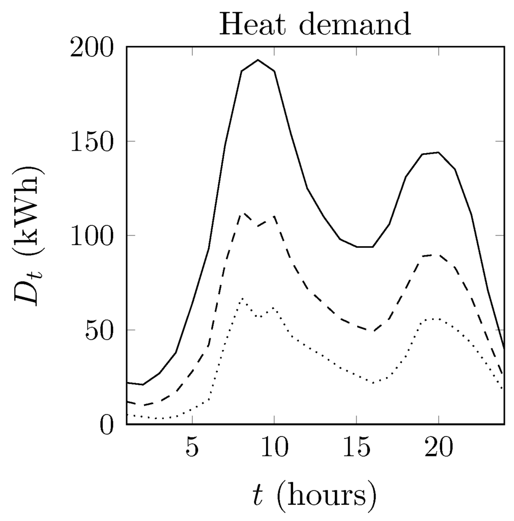 The seasonal heat demand profiles used in the optimizations for the Ecovat system. The solid line shows the heat demand profile for winter days, the dashed line for spring and autumn days and the dotted line for summer days.
