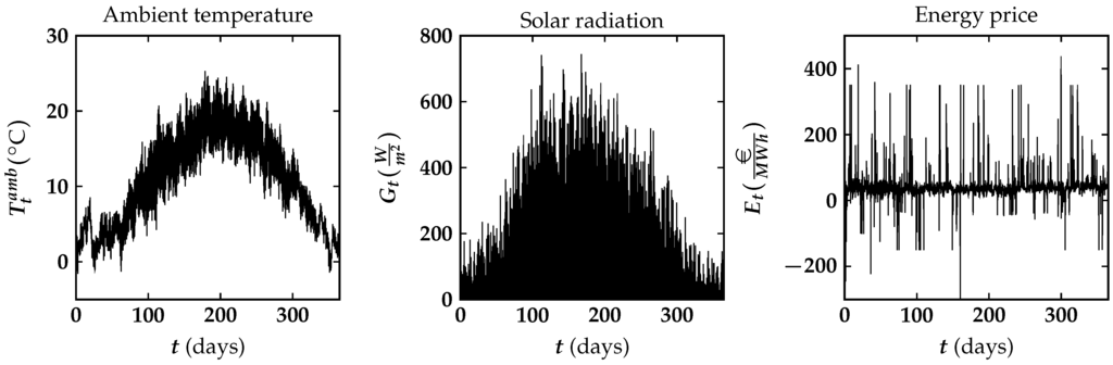 Next to the heat demand profiles, also profiles for the weather data and energy prices are required. For these profiles the ones used by [17] are used to be able to compare results between the models. For the weather data, historical data from 2005 to 2011 for the city of Eindhoven, where the apartment buildings are located, was averaged to obtain profiles for the ambient temperature and solar radiation during the year. For the energy price profile the prices on the Dutch imbalance market of 2014 were used. The resulting profiles are shown in Figure 5. It should be noted that due to the averaging of weather data over a number of years any extreme weather conditions will have been averaged out. Consequently the results presented in the next section will not include such extreme weather conditions. In future work we plan to use weather data of only a single year, which not only will include such conditions, but will also allow us to compare years with different weather conditions. Additionally, we will use the energy prices from the same year as it is expected that these are, among others, influenced by the weather conditions.