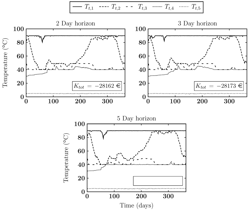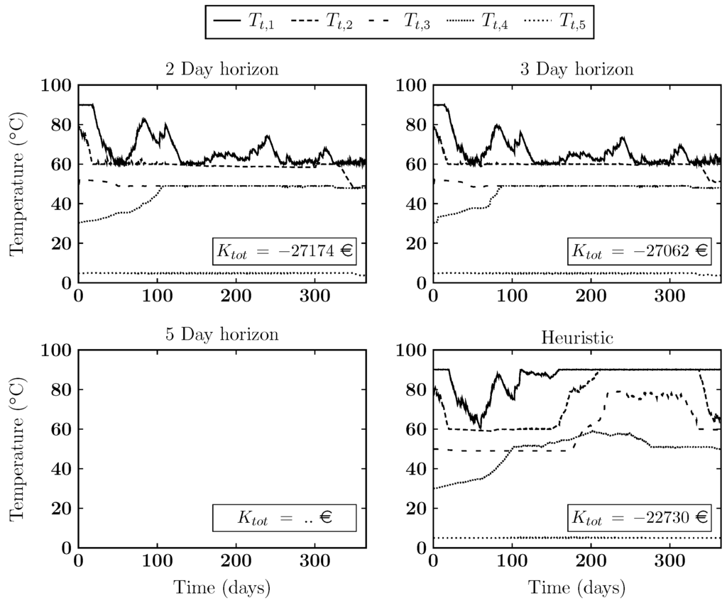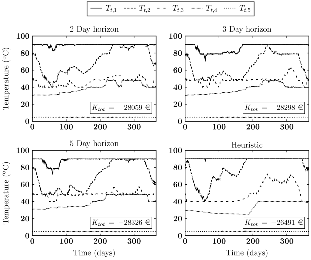 For the first scenario, the demand temperature, , is set to 40 °C. The results for this scenario are shown in Figure 7. In the figures the different lines give the temperature evolution inside the buffer. The objective value is also given in the figures. These results are presented for simulations using horizons of two, three and five days as well as for the heuristic model given in [17].